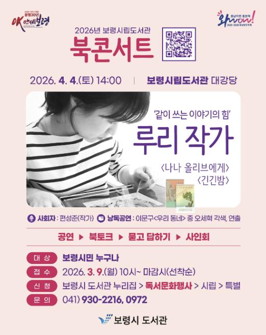 2024년을 시작으로 3년째를 맞는 보령시립도서관 북콘서트는 그간 김호연, 황보름, 윤정은, 천선란 등 국내 유명 작가들을 초청하며 시민들에게 큰 호응을 얻고 있다. 이번 북콘서트에서는 ‘같이 쓰는 이야기의 힘’이라는 주제로 루리 작가가 깊이 있는 이야기를 들려줄 예정이다.