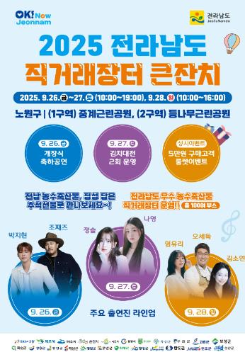[파이낸셜경제=김예빈 기자] 전라남도는 청정 자연에서 생산된 우수 농수축산물을 직접 선보이고, 판로를 확대하기 위해 26일부터 28일까지 3일간 서울시 노원구 중계근린공원과 등나무근린공원에서 대규모 직거래장터 큰잔치를 개장한다고 밝혔다.