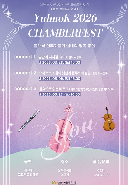 [파이낸셜경제=김기보 기자] 인천광역시는 율목도서관에서 지역 주민들이 일상 가까이에서 클래식 음악을 즐길 수 있도록‘율목 실내악 축제 'Chamberfest 2026'’을 개최한다고 밝혔다.