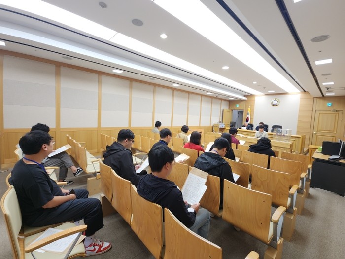 | ▲ 공주시 청년도전지원사업 청년들이 경매 법정에 참관하여 부동산 경매 입찰과정에 대한 설명을 듣고 있다. |