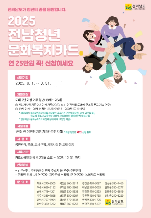 [파이낸셜경제=김예빈 기자] 전라남도가 오는 31일까지 지역 청년의 문화·여가 활동을 지원하는 ‘청년 문화복지카드’ 지원사업 신청자를 추가 모집한다.