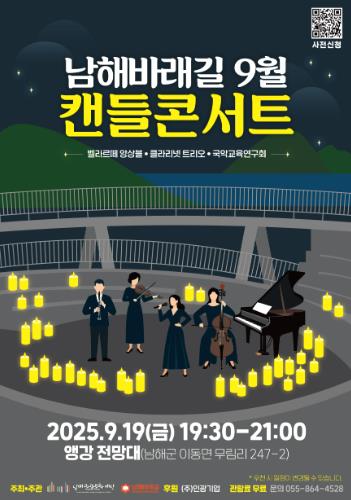 [파이낸셜경제=김예빈 기자] 남해군관광문화재단은 오늘 9월 19일 오후 7시 30분부터 이동면 앵강전망대(앵강휴게소)에서 ‘2025 남해바래길 작은음악회 – 9월 캔들콘서트’를 개최한다.