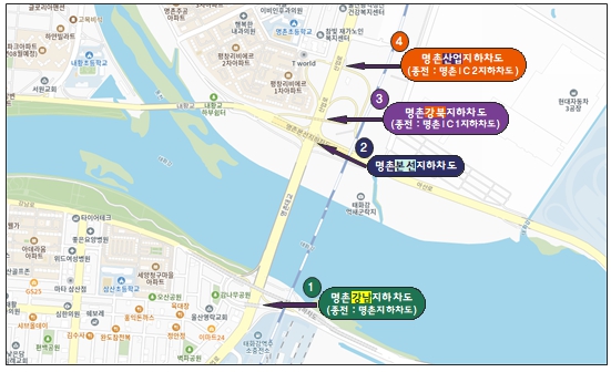 이에 따라 ‘명촌지하차도, 명촌아이시(IC)1지하차도, 명촌아이시(IC)2지하차도’를 각각 ‘명촌강남지하차도, 명촌강북지하차도, 명촌산업지하차도’로 변경하고, ‘명촌본선지하차도’는 원래 명칭을 그대로 사용한다.