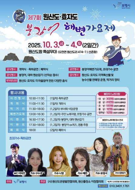 [파이낸셜경제=김영란 기자] 보령시가 주최하고 (사)원산도관광발전협의회가 주관하는 ‘제7회 원산도·효자도 붕장어 해변가요제’가 오는 10월 3일부터 4일까지 2일간 원산도항 특설무대에서 개최된다.