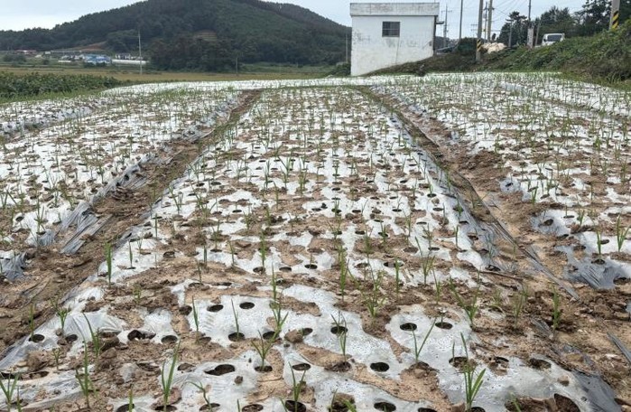 | ▲ 정식 후 지속적인 강우로 발아가 잘 되지 않은 태안 마늘밭 모습(2025. 10. 10.). |