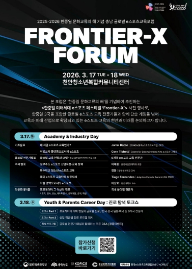 [파이낸셜경제=김영란 기자] 충남콘텐츠진흥원은 오는 3월 17일 ~ 18일 천안청소년복합커뮤니티센터에서 충남 글로벌 이스포츠 교육 포럼을 개최한다고 밝혔다.