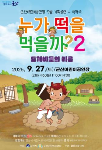[파이낸셜경제=김예빈 기자] 군산어린이공연장이 오는 27일 전통 이야기와 국악이 어우러진 특별한 국악극 '누가 떡을 먹을까? 2 – 도깨비들의 씨름'을 선보인다.