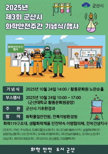 [파이낸셜경제=김예빈 기자] ‘화학사고 없는 안전도시 군산’ 실현을 위해 오는 10월 20일부터 24일까지‘제3회 군산시 화학안전주간’행사가 열린다.