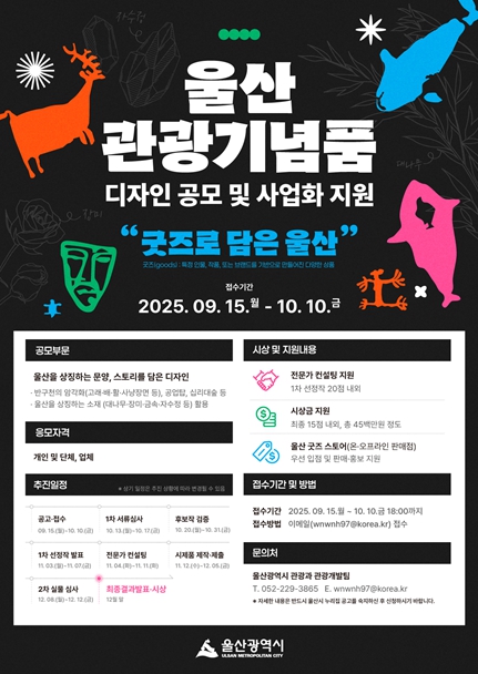 울산시 관계자는 “최근 케이팝 데몬 헌터스 열풍으로 케이(K)-관광기념품(굿즈)에 대한 관심이 높아진 만큼, 반구천의 암각화·공업탑·십리대숲·고래 설화 등 다양한 소재를 활용하여 울산을 상징할 수 있는 차별화된 작품이 나오길 기대한다”라며 “울산만의 독특한 정체성을 담아낼 관광기념품 개발에 많은 관심과 참여를 바란다”라고 말했다.