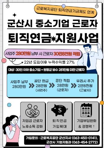 군산시는 여기에 더해, 공단이 근로자에게 적립해 주는 금액의 10%를 추가로 지원해 근로자 퇴직연금 계좌에 별도로 적립해 준다.