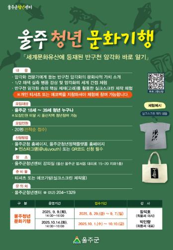 울주군 관계자는 “이번 문화기행은 청년들이 지역의 소중한 문화유산을 직접 체험하며 창의성과 감수성을 발휘하는 기회가 될 것”이라며 “지역 정체성과 문화적 자긍심을 높이는 데도 큰 의미가 있다”고 말했다.