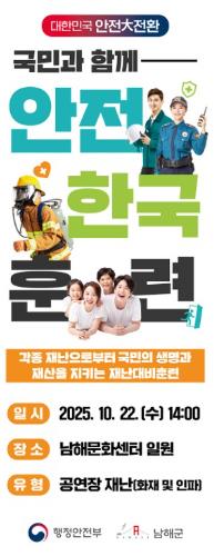 [파이낸셜경제=김예빈 기자] 남해군은 각 기관의 협업체계와 현장 대응능력을 점검하기 위해 오는 10월 22일 남해문화센터 일원에서 ‘2025년 재난대응 안전한국훈련’을 실시한다고 밝혔다.