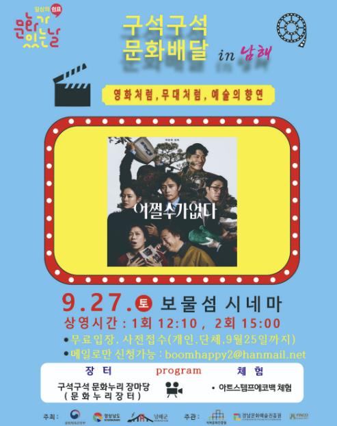 먼저 24일 오후 2시 남해읍 평리휴먼시아에서는 ‘LH와 함께하는 행복팡팡음악회’가 열린다. 이어 27일 보물섬시네마에서는 ‘영화처럼, 무대처럼, 예술의 향연’을 주제로 △영화 ‘어쩔수가없다’ 무료 상영(1회 12:10, 2회 15:00) △아트스탬프 에코백 만들기 체험 △구석구석 문화누리 장마당(문화누리카드 구매가능) 등 다채로운 프로그램이 진행된다. 영화 무료 관람은 이메일 사전 신청을 통해 참여할 수 있다.