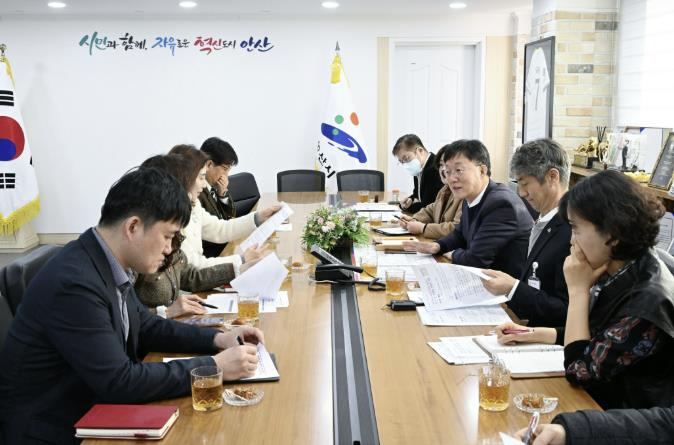 | ▲ 이민근 안산시장(오른쪽 세번째)이 14일 안산시청에서 '안산형 워킹스쿨버스' 도입 방안을 논의하기 위해 안산교육지원청 관계자들과 간담회를 진행하고 있다. |