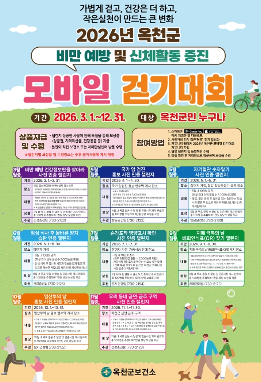 [파이낸셜경제=김기보 기자] 옥천군보건소는 지역주민의 일상 속 걷기 실천율을 높이고 건강증진을 도모하기 위해 ‘2026년 옥천군 모바일 걷기대회’ 커뮤니티를 운영한다고 밝혔다.