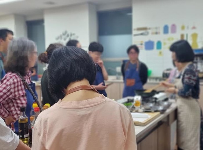 | ▲ 도봉구 주민들이 한 1인가구 음식만들기 행사에서 요리를 배우고 있다. |