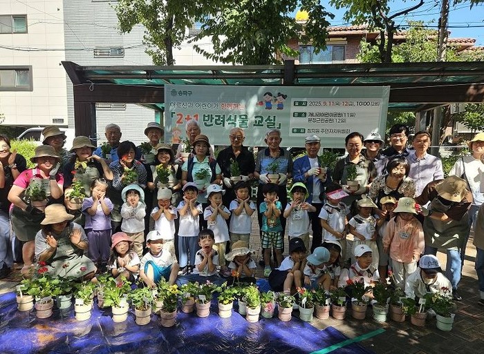 지난 11일에는 장지경로당과 버들어린이집, 12일에는 문정시영아파트 경로당과 힐스테이트아이편한세상어린이집이 참여해 어르신과 아이들이 함께 어우러져 식물 심기, 화분 꾸미기 등 활동을 하며 세대 간 장벽을 허무는 소통의 시간을 가졌다. 또, 송파구 마을정원사들이 봉사자로 참여해 어르신과 어린이들의 식물 가꾸기를 지원했다.