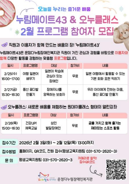 [파이낸셜경제=김기보 기자] 파주시 운정다누림장애인복지관은 참여형 평생학습 프로그램 ‘누림메이트43’을 운영하며, 정규 강좌로는 담기 어려운 소규모 학습 수요를 반영한 생활 밀착형 배움을 실천하고 있다.