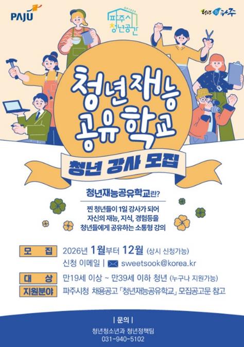 [파이낸셜경제=김기보 기자] 파주시는 2026년 1월부터 12월까지 청년을 대상으로 '청년재능공유학교' 청년강사를 연중 상시 모집한다.
