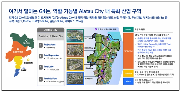 알라타우 시티는 카자흐스탄 알마티 북측에 조성 중인 대규모 신도시로, 금융·비즈니스, 의료·교육, 산업·물류, 관광·레저 등 기능별로 구분된 4개 특화 지구(G4)를 중심으로 개발이 추진되고 있다.