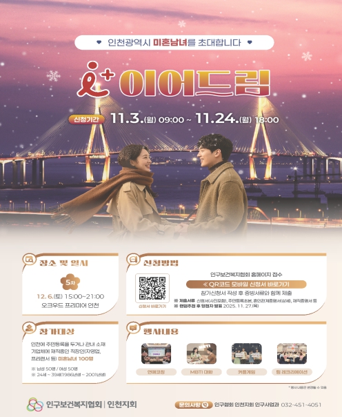 시현정 시 여성가족국장은 “연말을 앞두고 많은 인천 청년들이 참여해 소중한 인연을 맺는 활기찬 만남의 장이 되길 기대한다”라고 말했다.