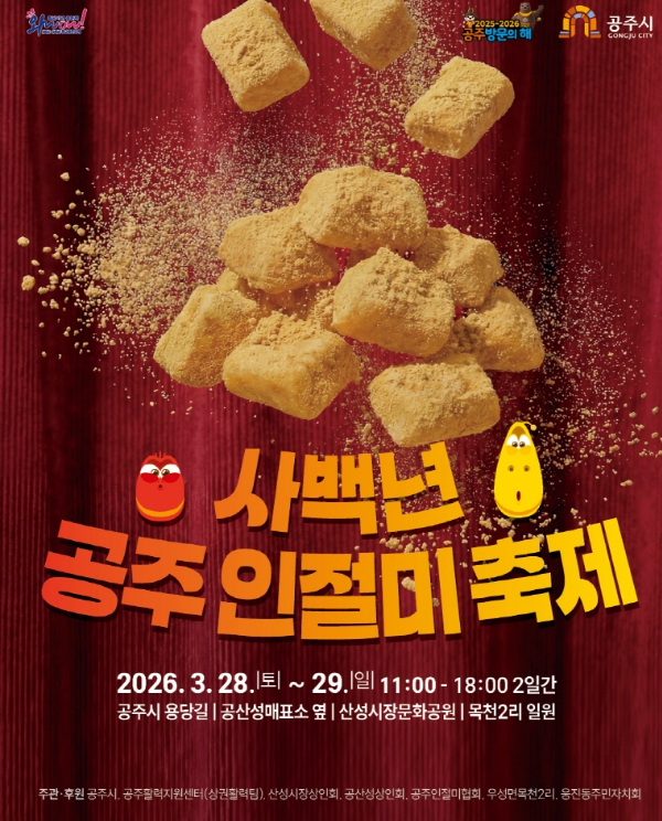[파이낸셜경제=김영란 기자] 공주시는 오는 3월 28일부터 29일까지 이틀간 산성시장과 공산성 일원 등 왕도심에서 ‘2026년 사백년 공주 인절미축제’를 개최한다고 18일 밝혔다.