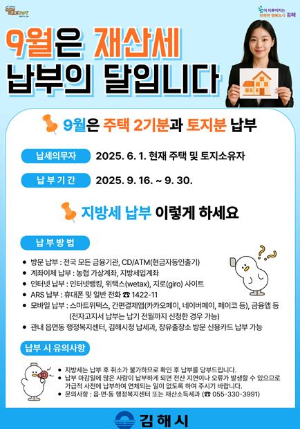 9월 재산세의 납부 기간은 이달 30일까지이며, 납세자들이 불편하지 않도록 최대한 다양한 납부 방법을 마련하여 운영 중이다.