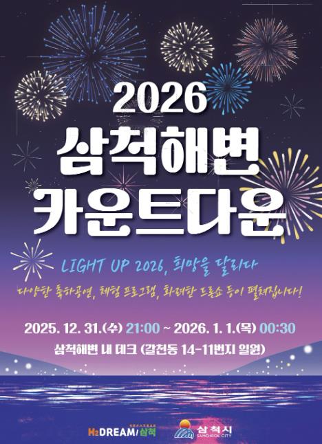 먼저 오는 12월 31일 오후 9시부터 삼척해변 데크무대에서 ‘2026 삼척해변 카운트다운’ 행사가 열린다. 시민 참여형 퀴즈와 이벤트를 비롯해 축하공연, 카운트다운 퍼포먼스 등이 어우러져 한 해의 마무리와 새해의 시작을 함께 축하하는 자리로 꾸며질 예정이다.