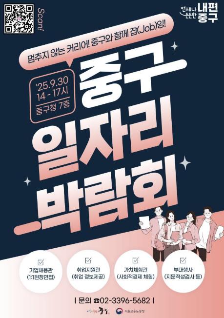또한, 중구청 앞 광장에서는 서울시 여성능력개발원의 ‘일자리 부르릉버스’가 운영돼 이력서 사진 촬영, 1:1 맞춤형 상담 등 실질적인 취업 지원 프로그램도 함께 제공한다.