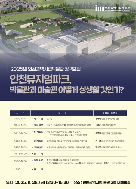 [파이낸셜경제=김기보 기자] 인천광역시 시립박물관은 오는 11월 28일 인천시청 대회의실에서 ‘인천뮤지엄파크, 박물관과 미술관 어떻게 상생할 것인가?’를 주제로 정책 포럼을 개최한다고 밝혔다.