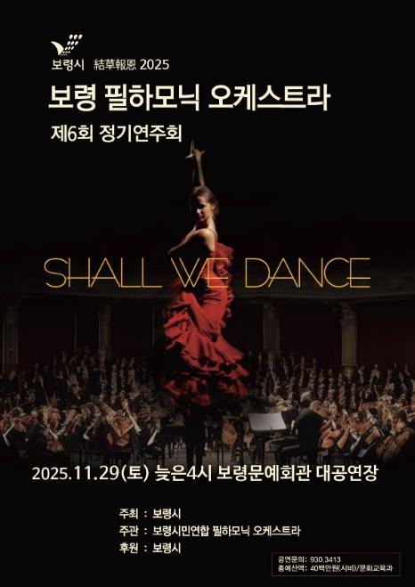 [파이낸셜경제=김영란 기자] 보령시민연합 필하모닉 오케스트라가 오는 11월 29일 오후 4시 보령문화예술회관 대공연장에서 제6회 정기연주회 ‘Shall We Dance’를 개최해 시민들에게 특별한 음악적 감동을 선사한다.