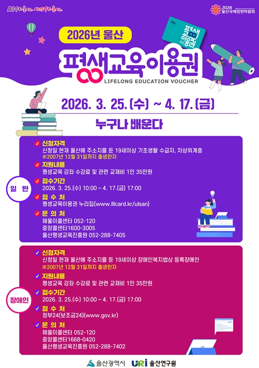 [파이낸셜경제=김예빈 기자] 울산시는 시민 누구나 평생학습의 기회를 누릴 수 있도록 ‘2026년 울산광역시 평생교육이용권(이하 이용권) 지원사업’을 본격 추진한다고 밝혔다.