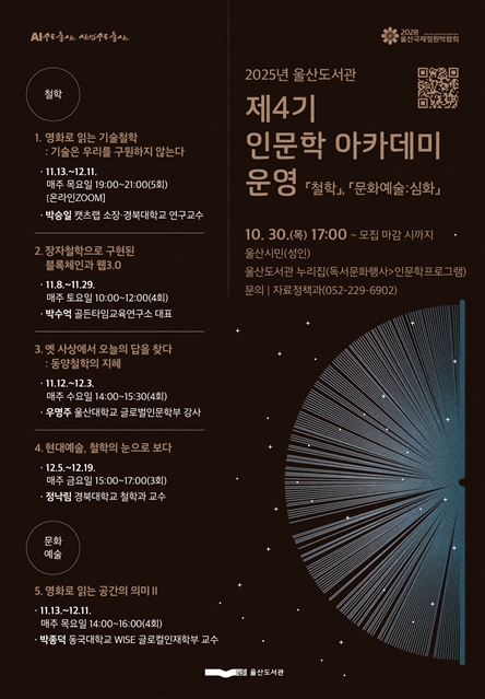 [파이낸셜경제=김예빈 기자] 울산도서관은 오는 11월부터 `‘2025년 제4기 인문학 아카데미’를 운영한다고 밝혔다.