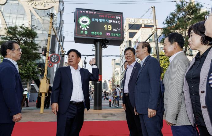 | ▲ 박강수 마포구청장이 미세먼지 현황이 송출되고 있는 레드로드 재난문자전광판을 살펴보고 있다. |