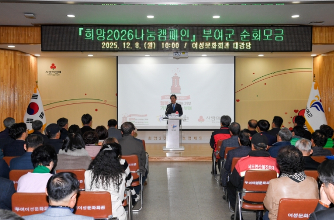 [파이낸셜경제=김영란 기자] 부여군은 ‘행복을 더하는 기부, 기부로 바꾸는 부여’라는 구호 아래 '희망 2026 나눔 캠페인' 순회 모금 행사를 지난 8일 여성문화회관 3층 대강당에서 개최했다.