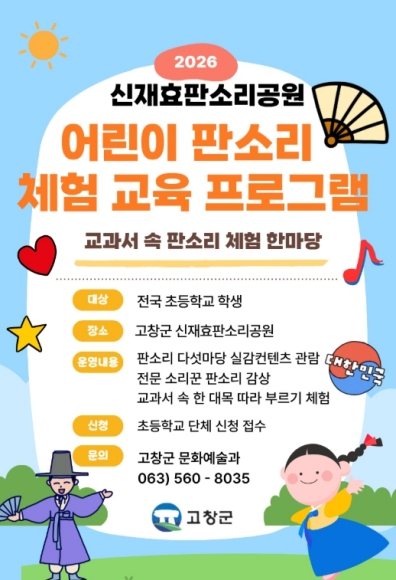 [파이낸셜경제=김예빈 기자] 고창군 신재효판소리공원이 전국 초등학생을 대상으로 ‘판소리 다섯마당 실감컨텐츠 연계 체험 교육 프로그램’을 운영한다고 26일 밝혔다.