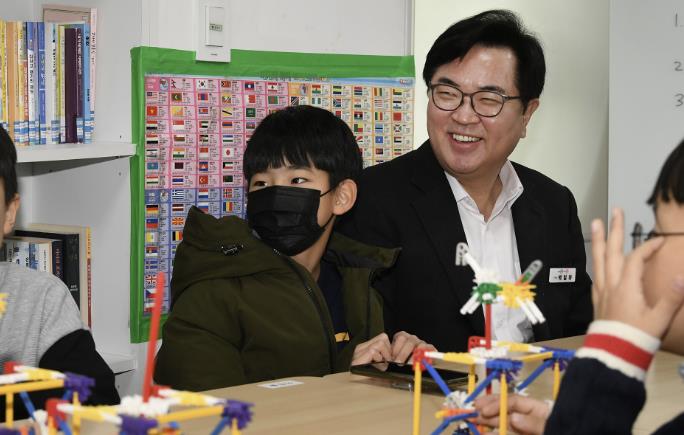 | ▲ 박일하 동작구청장이 지난해 12월 서울 동작구 사당3동 우리동네키움센터에서 ‘AI 로봇 발명 메이커 대회’ 수상 아동들과 대화를 나누고 있다. |
