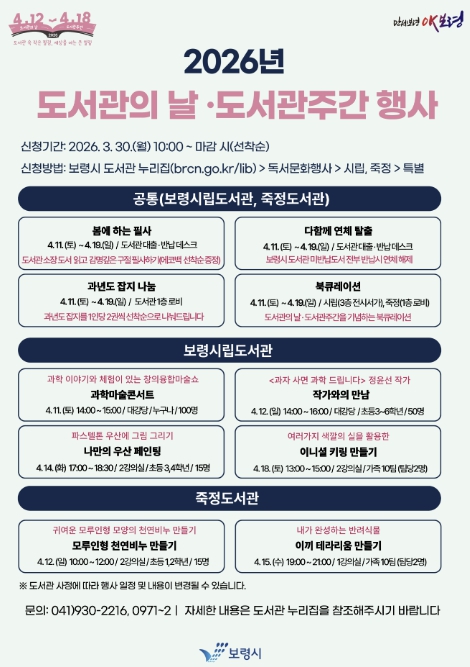 [파이낸셜경제=김영란 기자] 보령시는 2026년 도서관의 날·도서관주간을 맞아 보령시 도서관에서 공연, 강연, 체험, 독서 이벤트 등 다채로운 문화행사를 진행한다고 27일 밝혔다.