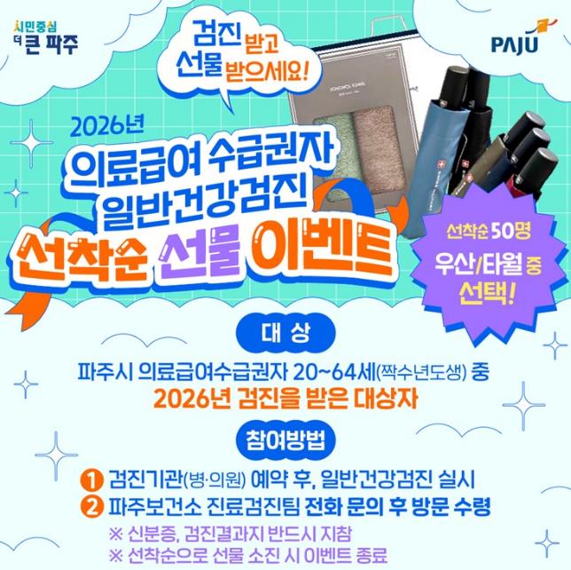 검진 희망자는 가까운 일반건강검진 지정 의료기관에 사전 예약한 후 신분증을 지참해 방문하면 된다. 검진 후 결과지와 신분증을 지참해 파주보건소 진료검진팀으로 찾아오면 선물을 받을 수 있으며, 방문이 어려운 경우 택배 수령도 가능하다.