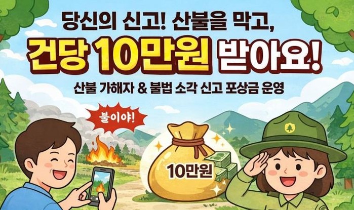 산림 또는 산림 인접 지역(100m 이내)에서 발생하는 논·밭두렁 태우기, 쓰레기 소각 등 불법 행위를 신고해 가해자 검거에 기여하거나 산불 확산을 방지한 경우, 건당 10만 원의 포상금을 지급한다.