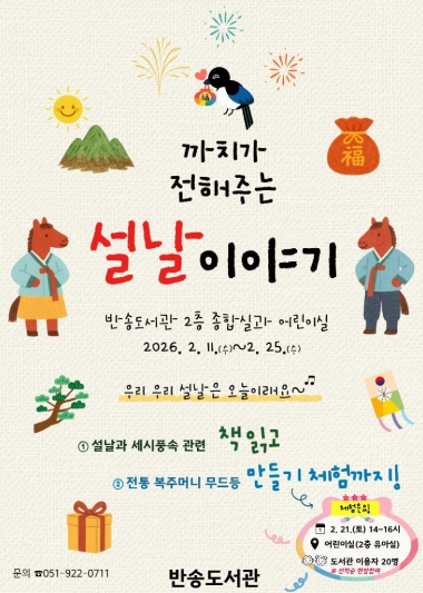 [파이낸셜경제=박영진 기자] 부산광역시립반송도서관(관장 박미양)은 우리나라 대표 전통 명절 설날을 맞아 사학특성화 프로그램 ‘까치가 전해주는 설날 이야기’를 오는 11일부터 25일까지 운영한다.