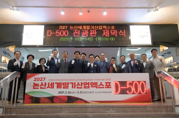 논산시는 14일 시청 중앙현관에서 ‘2027 논산세계딸기산업엑스포 D-500 기념 전광판 제막식’을 열었다.