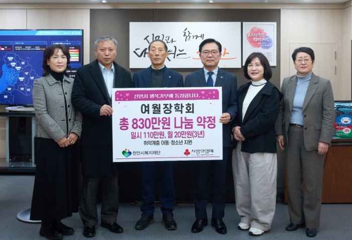 여월장학회는 이날 천안시청 부시장실에서 열린 전달식에서 일시금 110만 원과 함께 3년간 매월 20만 원의 정기후원을 약정했다. 장학회는 지난 2023년부터 재단 후원에 참여해 지난해까지 총 680만 원을 기탁하는 등 지속적인 나눔을 실천해 오고 있다.