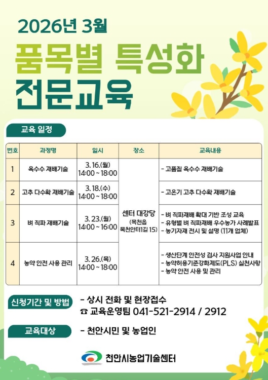 [파이낸셜경제=김영란 기자] 천안시농업기술센터는 본격적인 영농철을 앞두고 ‘품목별 특성화 전문교육’을 운영한다고 6일 밝혔다.