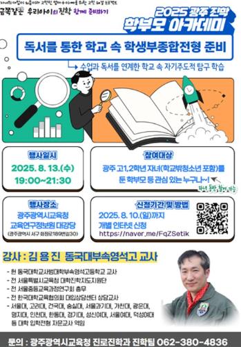 특히 동국대부속영석고등학교 김용진 교사가 강연을 맡아 독서가 수업에 어떤 도움이 되고, 어떻게 독서해야 대입에 도움이 되는지, 자기주도적 독서로 어떻게 탐구학습을 할 것인지 등 학생과 학부모가 궁금해하는 내용을 소개할 예정이다.