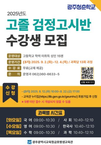 [파이낸셜경제=김예빈 기자] 광주시교육청금호평생교육관은 오는 9월부터 12월까지 운영하는 ‘3기 고졸 검정고시반’ 수강생을 선착순 모집한다.