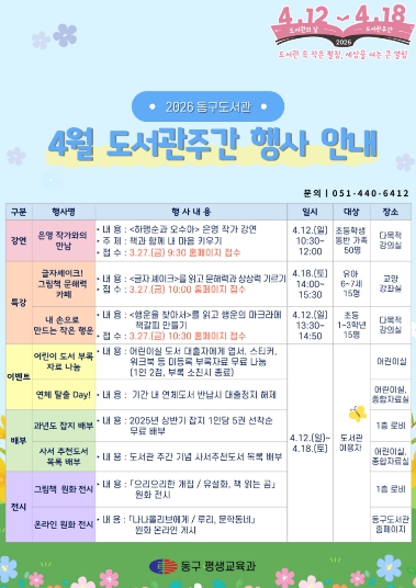 [파이낸셜경제=박영진 기자] 부산 동구는 4월 도서관주간(4.12.~18.)을 맞아 동구도서관 및 동구어린이영어도서관에서 다채로운 독서문화 향유 행사를 운영한다고 밝혔다.