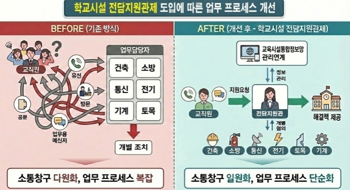특히 기존에는 학교에서 공사 감독이나 시설관리와 관련한 문제가 발생하면 토목․건축․기계․전기․소방 등 분야별 담당자를 각각 찾아 개별적으로 문의해야 하는 등 절차가 복잡하고, 전문적인 기술지원을 받는 데에도 어려움이 있었다.