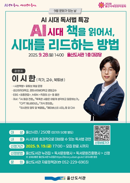 특강 참가 신청은 9월 19일 오후 5시부터 울산도서관 누리집을 통해 선착순 250명을 모집한다.