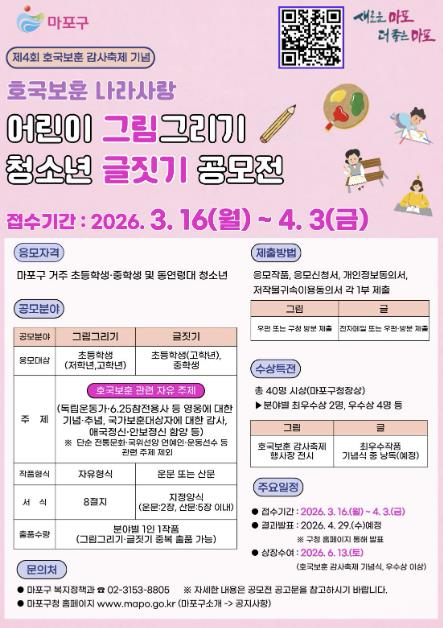 [파이낸셜경제=김예빈 기자] 마포구는 제4회 호국보훈 감사축제를 맞아 어린이와 청소년이 국가보훈대상자의 희생과 헌신을 기억하고 나라사랑의 의미를 되새길 수 있도록 ‘호국보훈·나라사랑 어린이 그림그리기·청소년 글짓기 공모전’을 개최한다.